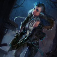 dark hair and is holding what seems to be a weapon, possibly an assault rifle. The setting includes elements that suggest she might be in a dystopian or post-apocalyptic environment. There are