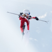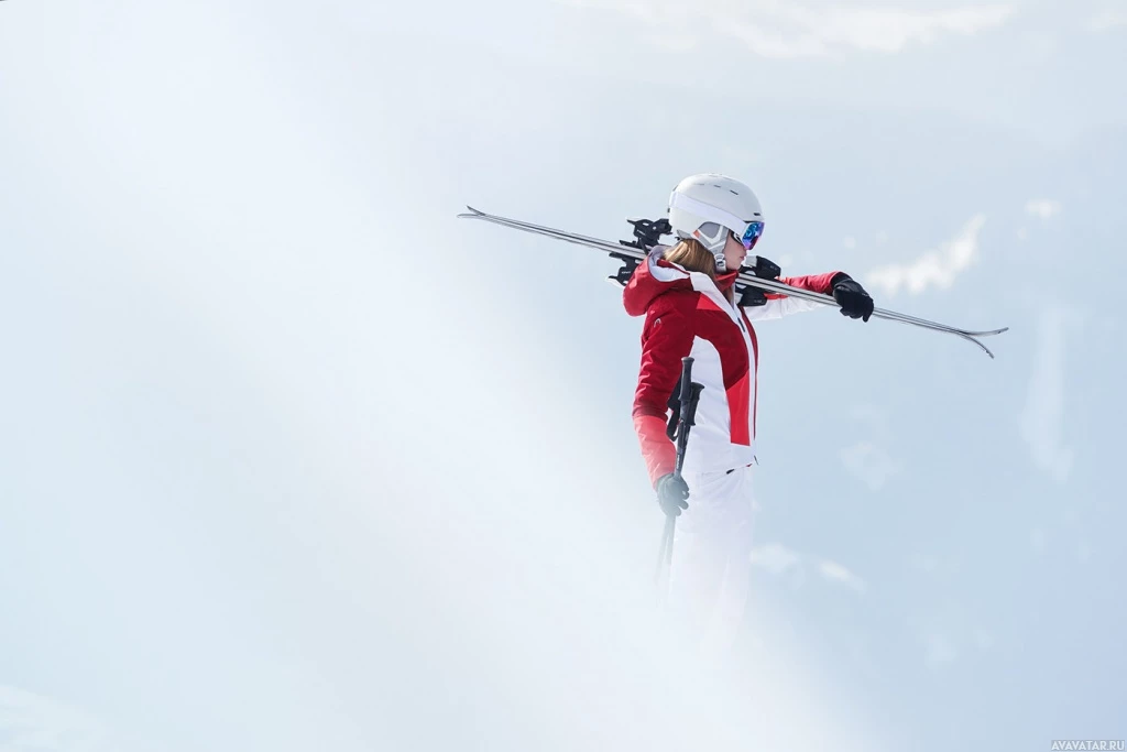 winter clothing appropriate for the sport, including what appears to be a helmet for safety. The background features