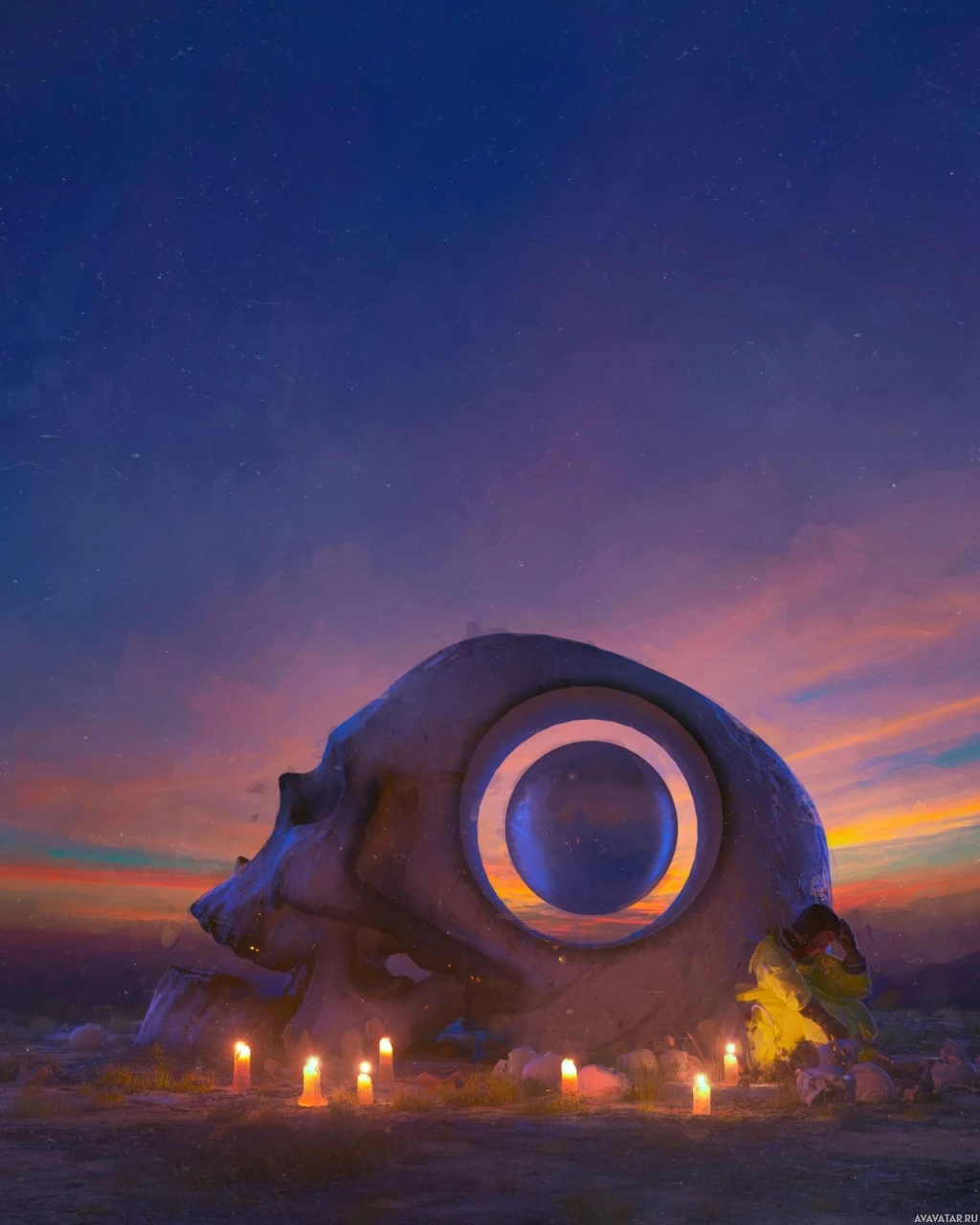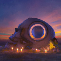 glowing skull with an eye-like feature. There is a candlelit altar in front of the skull on what appears to be