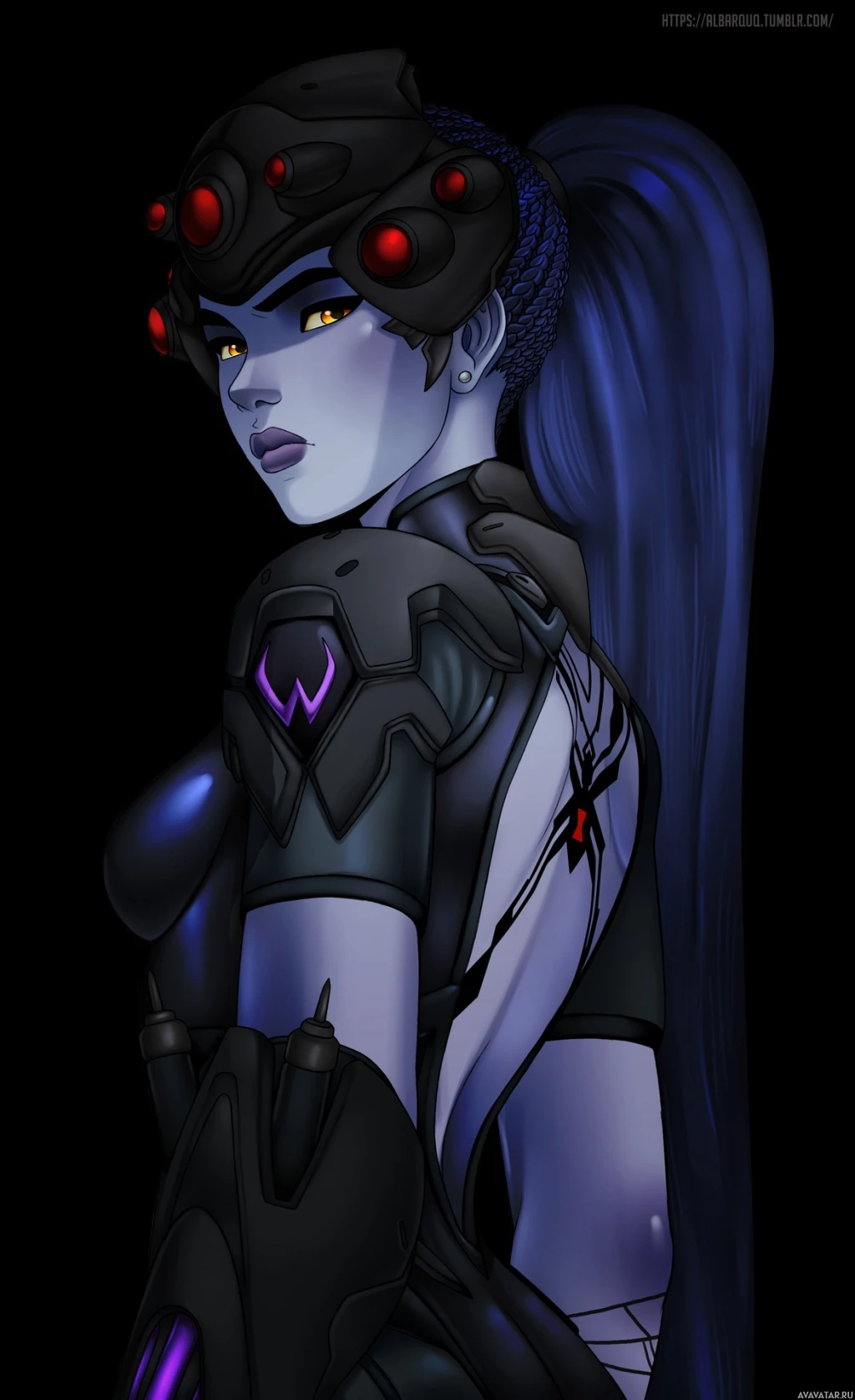 the video game Overwatch. The character is depicted in a pose that showcases her back and side profile, highlighting elements such as her armor and the distinctive