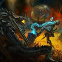 a humanoid figure wielding what appears to be an enchanted or magical weapon, possibly a staff, directed towards the dragon. The dragon is positioned in the center of the image, with its body coiled and its head raised in