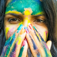 colorful paint, resembling the appearance of a child's painting. The person is looking directly at the camera and has their mouth open slightly as if they are speaking or reacting to something. The background is blurred, making it difficult to discern specific details. The overall impression is playful and vibrant due to the paint on the person's face.