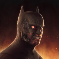 The image features a character that is a fusion between Batman and the Terminator. This character has the iconic appearance of Batman, including his cowl and suit, but with mechanical enhancements commonly associated with the Terminator series. It appears to be a digital artwork or illustration rather than a photograph of an actual scene.