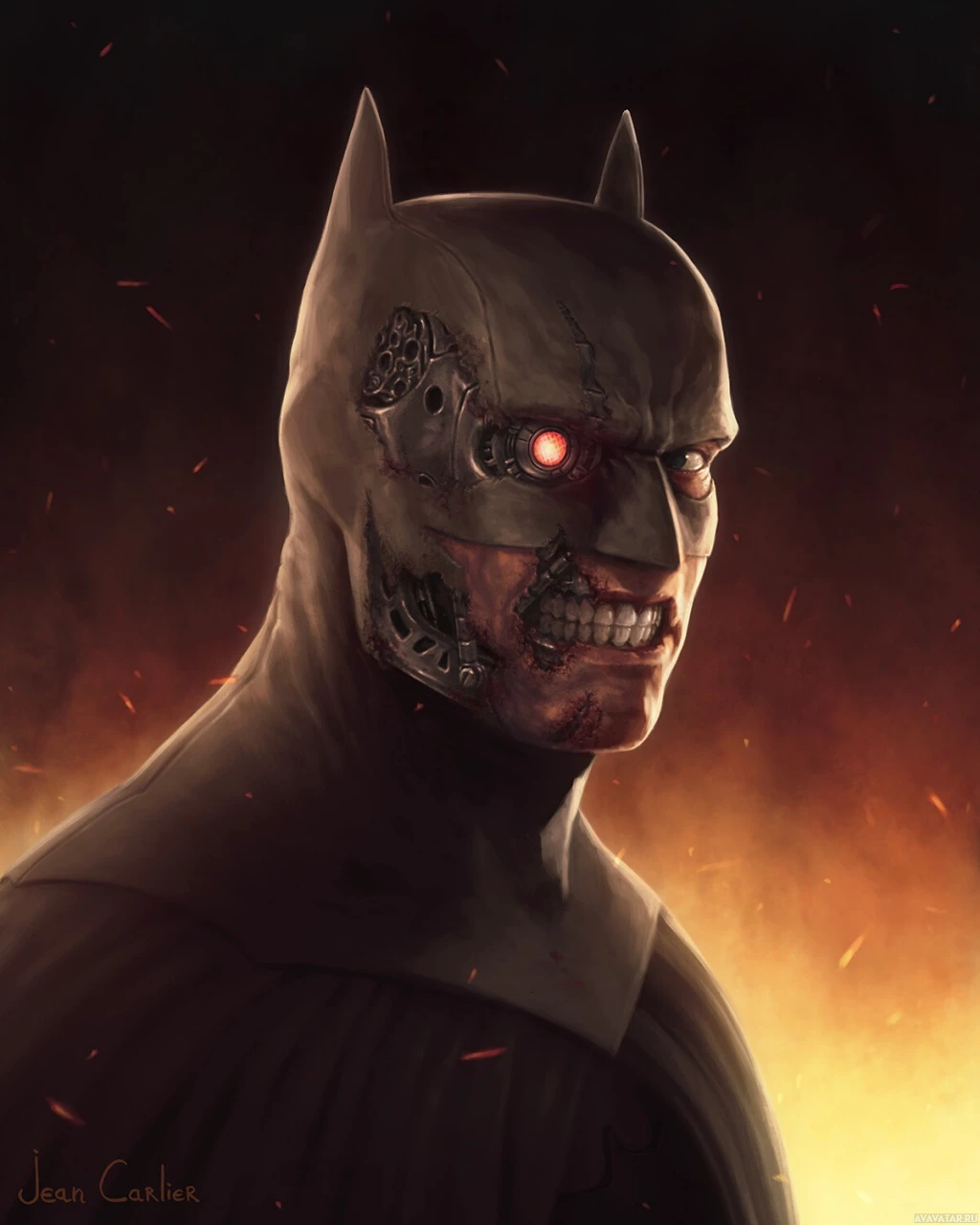 На картинке изображен персонаж, представляющий собой нечто среднее между Бэтменом и Терминатором. Этот персонаж имеет культовую внешность Бэтмена, включая его капюшон и костюм, но с механическими усовершенствованиями, которые обычно ассоциируются с серией "Терминатор". Похоже, что это скорее цифровое произведение искусства или иллюстрация, чем фотография реальной сцены.