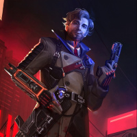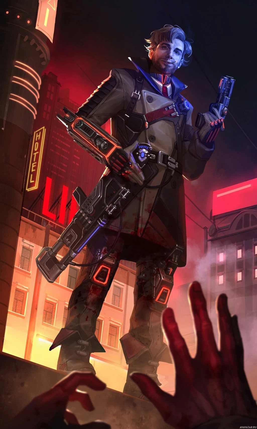 a robotic arm, suggesting advanced technology or cyberpunk themes. In his hands, he holds what appears to be a weapon, further emphasizing the futuristic and potentially combat-oriented