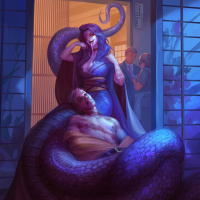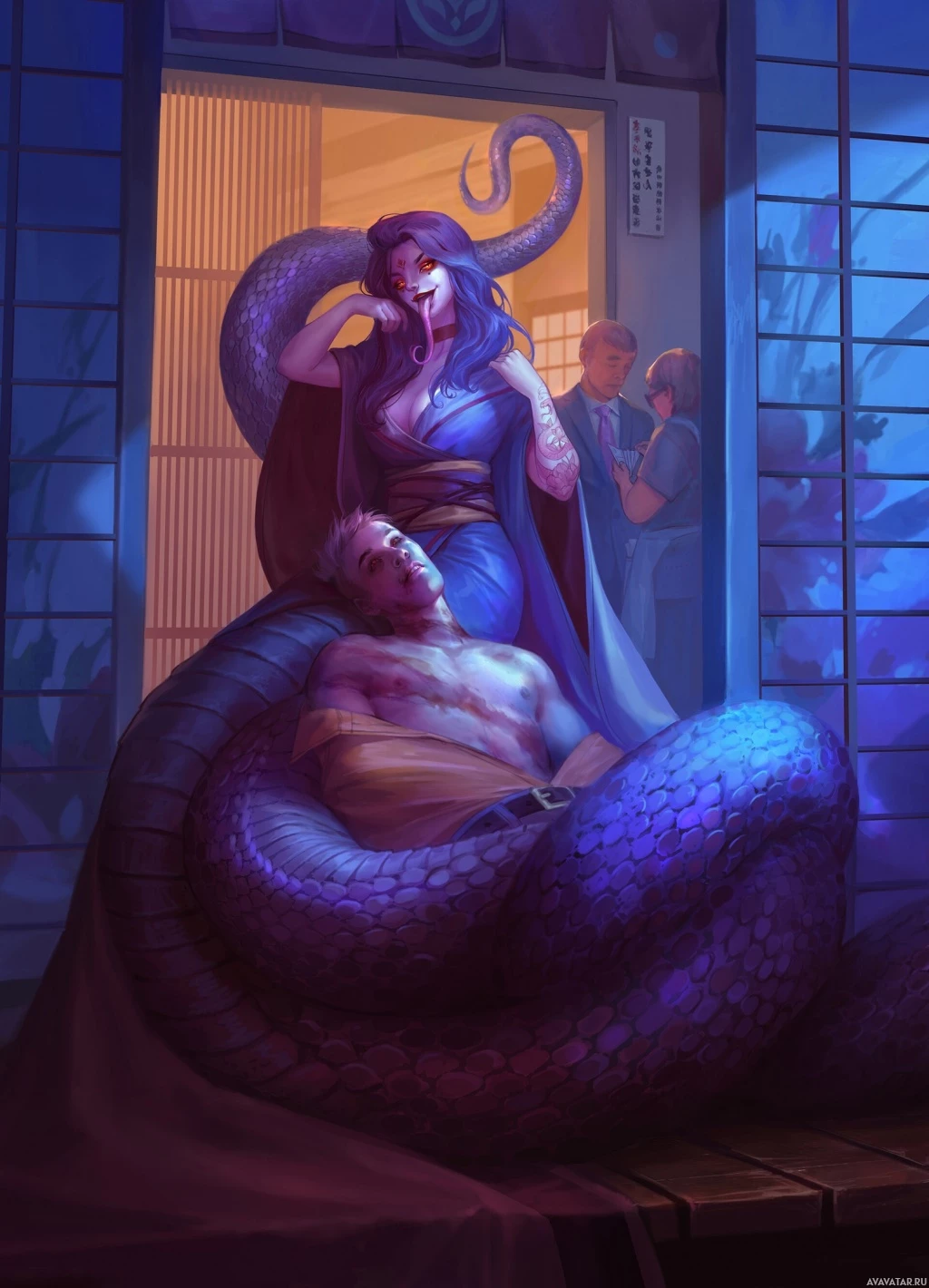 human figures who appear to be observing the interaction between the snake creature and the person. The setting appears to be a room with traditional Japanese architecture, featuring wooden paneling and sliding doors.