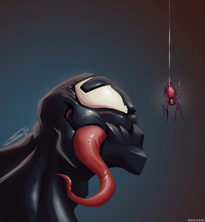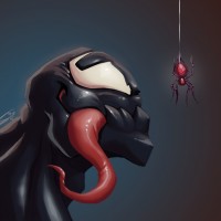 muscular build, pointed teeth, and long tongue. The overall tone of the image suggests a sense of anticipation or preparation for battle between Venom and the spider, which is commonly associated with Spider-Man in