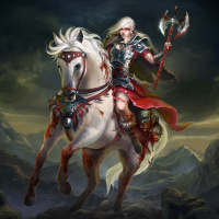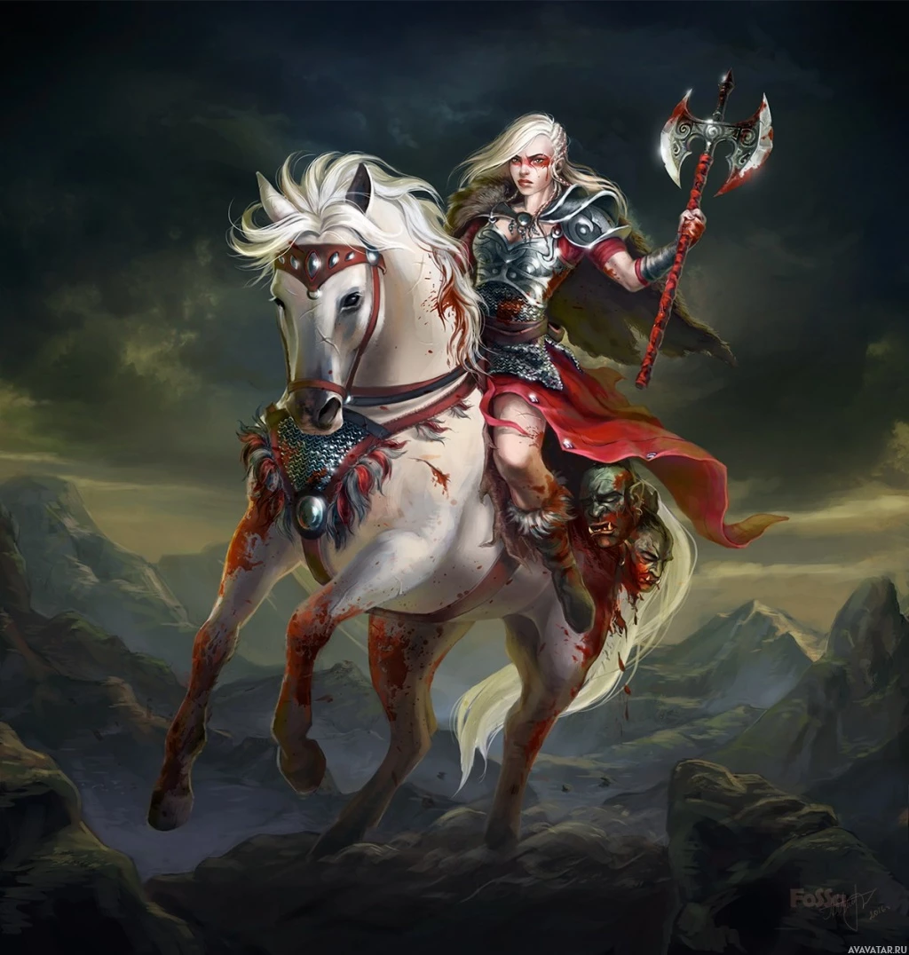a female warrior riding a white horse. She has long, wavy