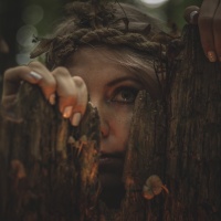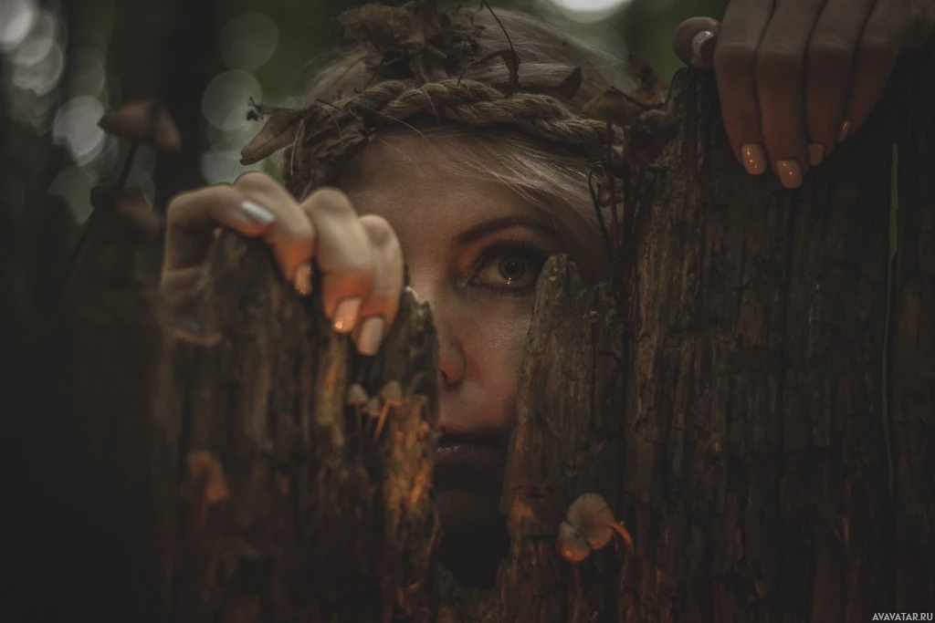 long hair peeking through what appears to be tree bark or part of a natural structure. The person has an ethereal quality and is wearing makeup that gives them a somewhat mysterious or otherworldly look. They are not fully visible; only their eyes and the upper part of their head can be seen as they look over a branch or piece of wood with leaves on it. It's a close-up shot that focuses attention on the person's face and expression, which seems contemplative or perhaps playful given the way they are hiding behind the natural object.