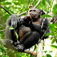 На картинке изображена обезьяна, сидящая на ветке дерева. Кажется, что она тянется к чему-то в своей руке или, возможно, к еде, которую держит. По краям изображения присутствует некоторая размытость, что указывает на движение или небольшую глубину резкости на фотографии.