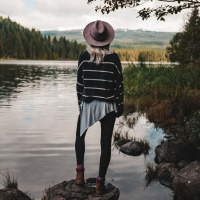 На картинке изображена девушка, которая, кажется, стоит на камнях у водоема. На ней надета шляпа, и кажется, что она смотрит в сторону от камеры, на озеро или реку. Обстановка предполагает естественную обстановку с деревьями вокруг и, возможно, горами на заднем плане.