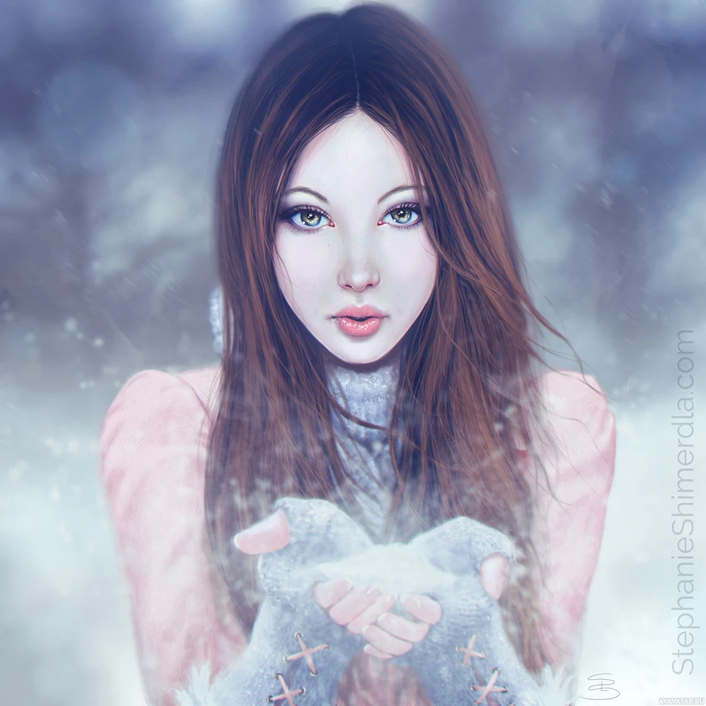 red hair. She is holding out her hands as if she is gently touching something or gesturing towards the viewer. The background suggests it's snowing or there's a dusting of