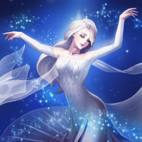 white hair, wearing a long, flowing dress that suggests she might be a princess or a magical creature of some sort. She is in a pose as if dancing or floating, with one arm stretched out and the other bent at the elbow. The background is starlit, indicating