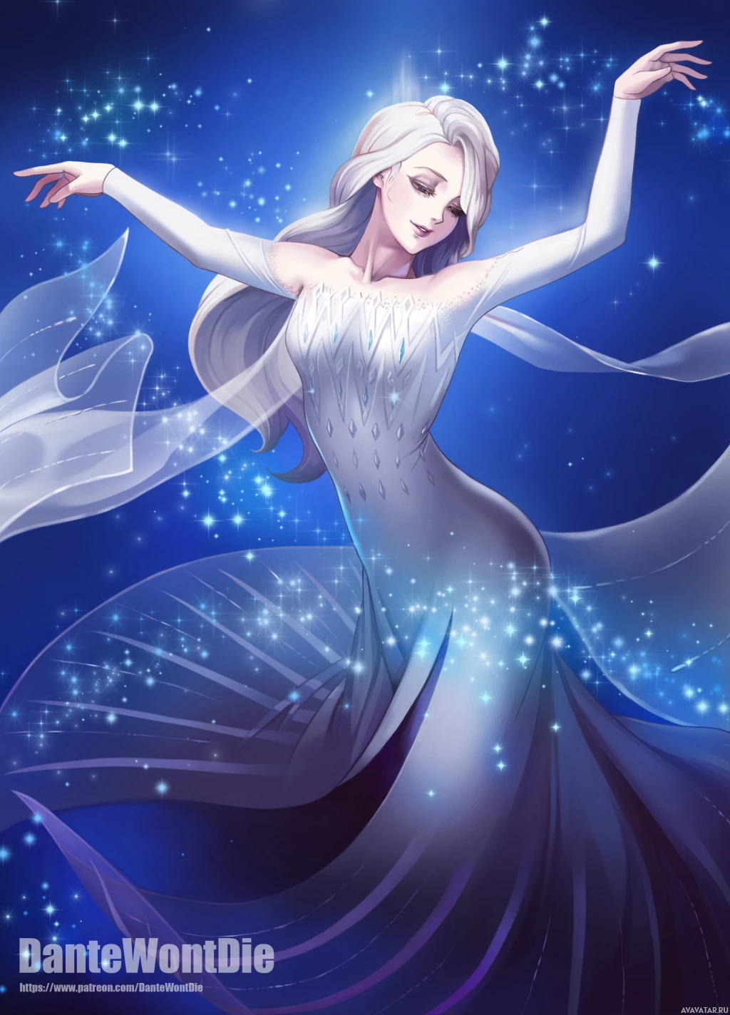 blue sparkles around her dress that add to the magical theme of the image. The character is not explicitly labeled as Elsa from