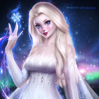 blonde hair and is holding what appears to be a wand or staff with her right hand, suggesting she may have some sort of magical abilities. She is standing against a backdrop that features cosmic elements such as stars and nebulas, which adds to