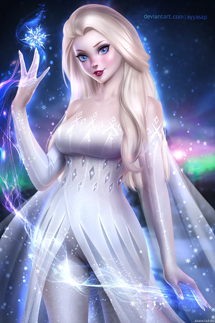 a female character dressed in a sleek, silver and white outfit with a magical theme. The character has long