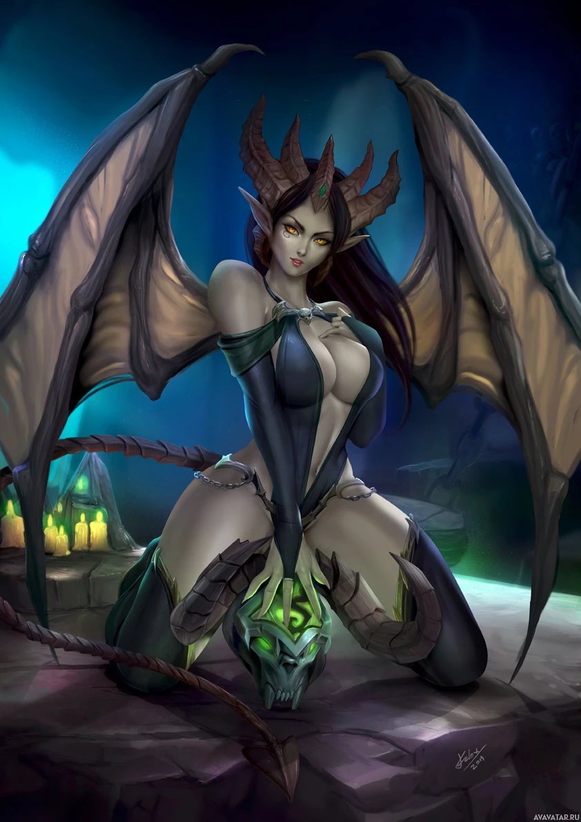 a mythical creature that typically takes the form of a beautiful woman and is known for being seductive to men, leading them into dangerous or tempting situations. In this illustration, the succubus has wings, horns, pointed ears, and is shown in an alluring pose with