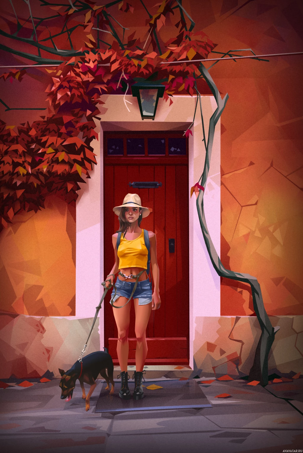 autumn leaves scattered on the ground, indicating it might be fall season. The setting looks like a quaint town with an old-fashioned