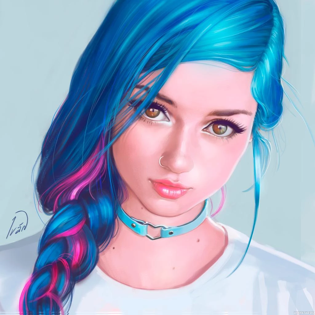 На картинке изображена молодая женщина с голубыми волосами. На щеках у нее розоватый румянец, и она накрашена, в том числе, похоже, подводкой для глаз. Ее волосы заплетены в косу, украшенную разноцветными прядями на концах. Изображение является скорее иллюстрацией, чем фотографией.