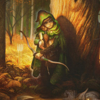 На картинке изображена молодая девушка, одетая во что-то похожее на костюм для стрельбы из лука, включая капюшон и плащ. Она сидит в тени большого дерева, а ее лук и стрелы лежат рядом с ней на земле. Обстановка наводит на мысль, что она могла бы быть персонажем фантастической истории или игры, действие которой разворачивается в лесу. Свет, пробивающийся сквозь деревья, придает сцене волшебную осеннюю атмосферу.