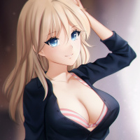 blonde hair and blue eyes. She has a cheerful expression on her face and is wearing a black shirt over a white