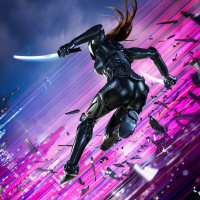 a female character, who appears to be running or falling forward in an action pose. She is wearing a black bodysuit with armor elements that could suggest