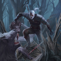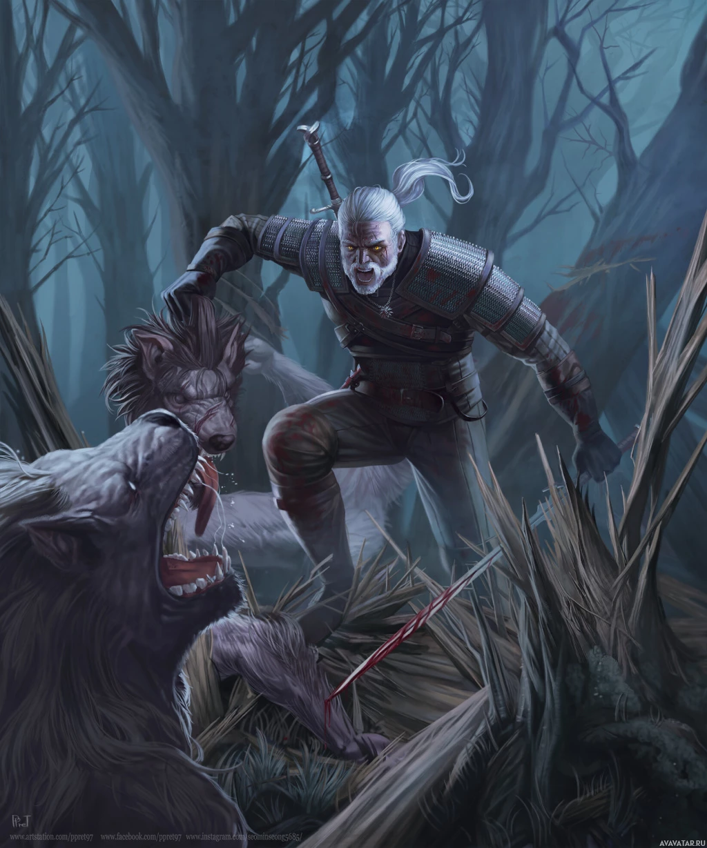 The image depicts a fantasy scene featuring a character who appears to be a witcher, as indicated by the style of clothing and armor that is reminiscent of the popular