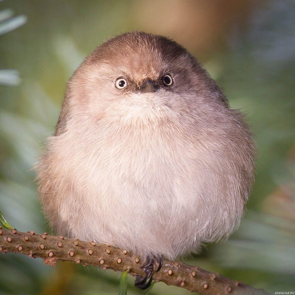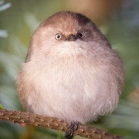 a round body with a short tail and appears to be perched on a branch or twig. The bird's feathers are fluffed up, suggesting it might be in the process of preening or preparing for flight. Its expression seems neutral, and it is looking directly at the camera. This
