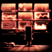 computer monitors displaying various graphs and charts. The individual appears to be engaged in monitoring or analyzing data, possibly related to finance, stock