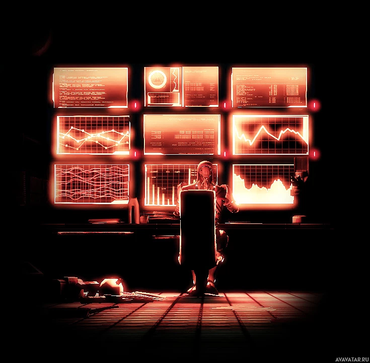 market trends, or some other form of complex information. The setting seems to be an office or control room with a dim lighting atmosphere, which might suggest a late-night session or a high level of concentration required for