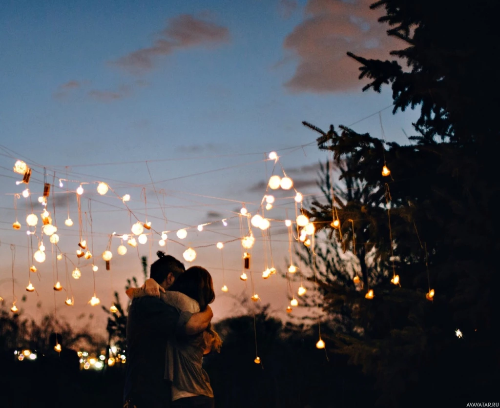 In the picture, there are two individuals embracing each other near a string of