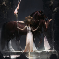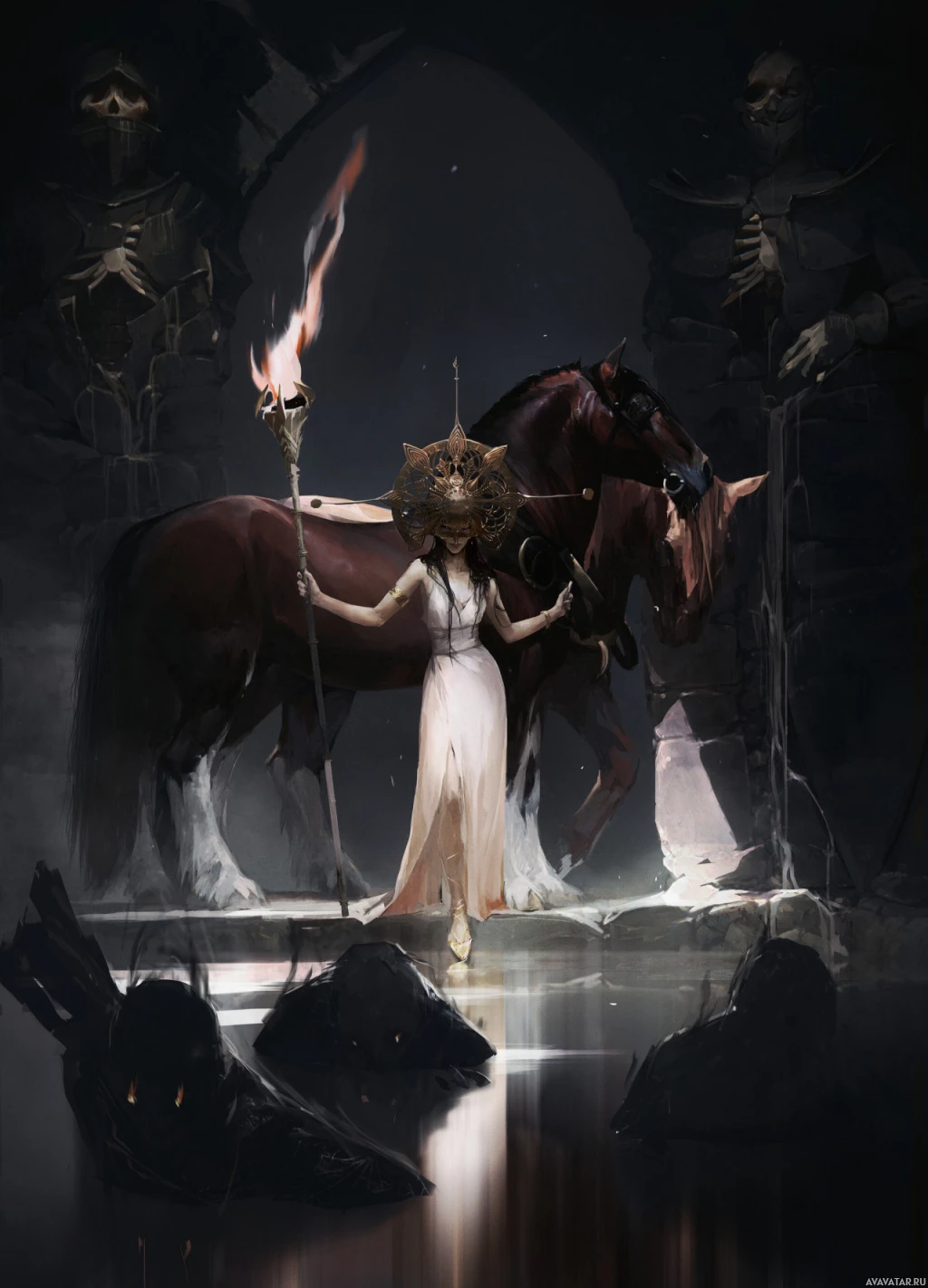 brown horse with a majestic posture. The horse also appears to be adorned with armor on its body, which indicates it might be trained for battle or warfare. The setting is dark and eerie, featuring