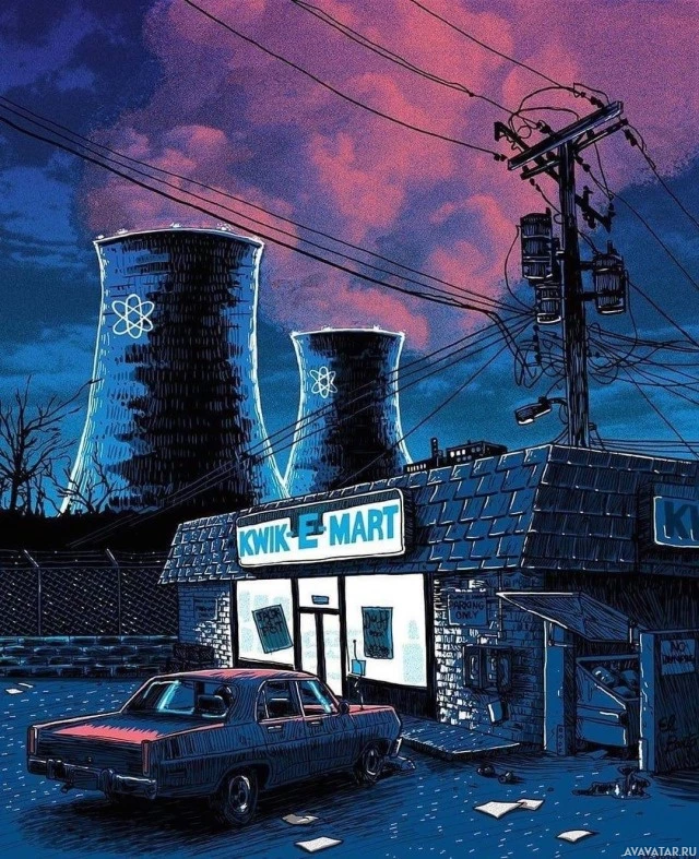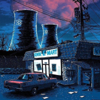 an illustrated scene set at night with a nuclear plant in the background. In the foreground, there is a dilapidated building labeled "Kwik-E-Mart," which is often associated with