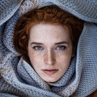 The image shows a young woman with red hair. She is wearing a cozy, textured sweater that appears to be knitted. The background is softly blurred, suggesting a warm and comfortable setting. Her expression is neutral, and she has a delicate complexion with what seems to be freckles on her cheeks.