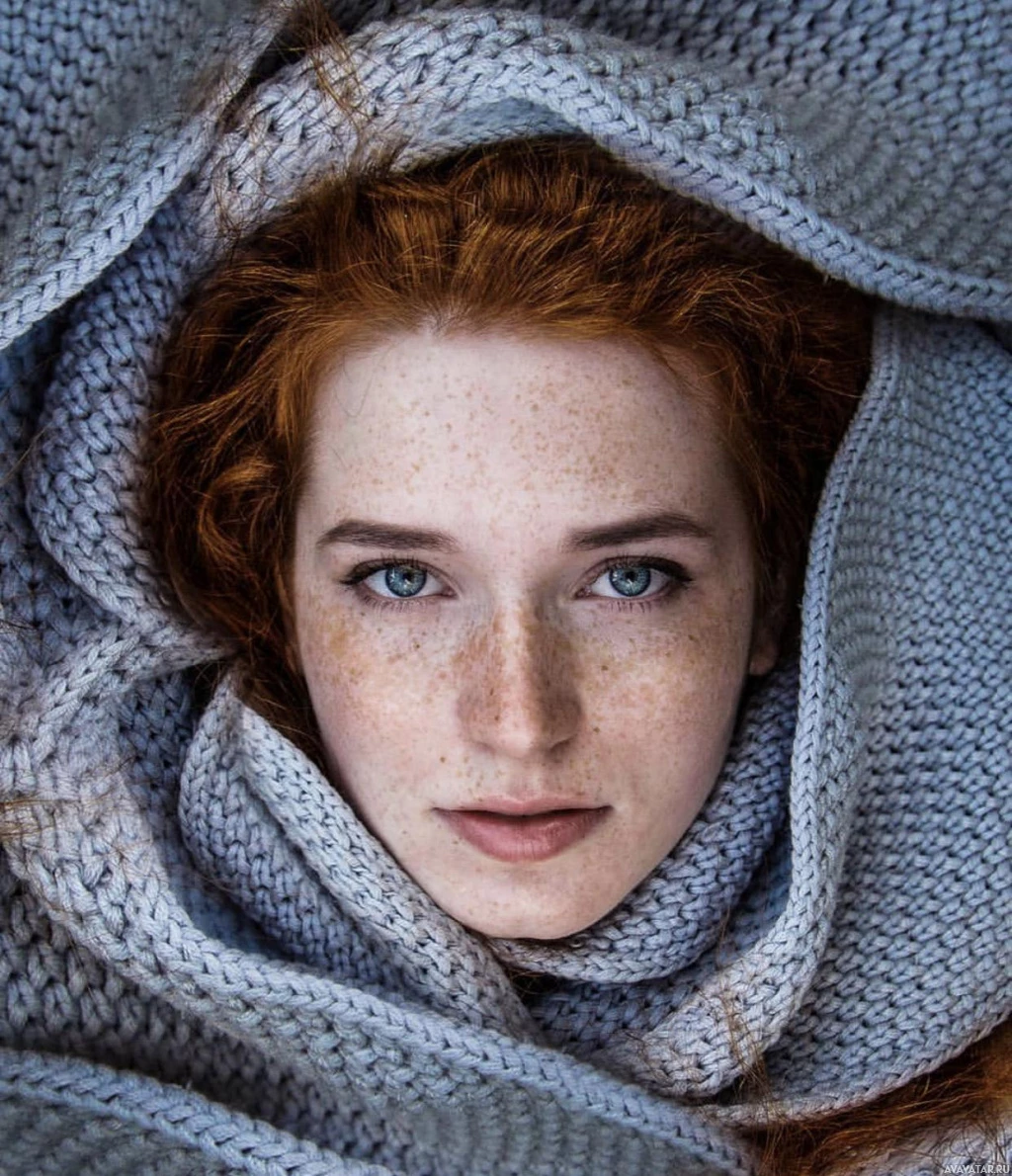 На картинке изображена молодая женщина с рыжими волосами. На ней уютный вязаный свитер с фактурной отделкой. Фон слегка размыт, что создает ощущение тепла и уюта. Выражение ее лица нейтральное, а цвет лица нежный, и на щеках что-то похожее на веснушки.