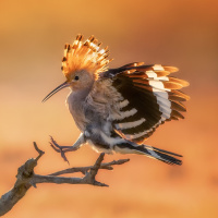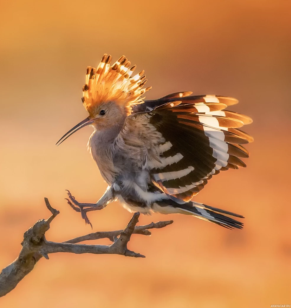 На картинке изображена птица, похожая на райскую, с характерным хохолком и ярким оперением. Птица сидит на ветке на фоне заката или восхода солнца, что придает пейзажу теплое сияние.