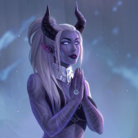 a fantasy character that appears to be a draenei female from the Warcraft universe. She has horns and pointed ears, typical of her species, which are often associated with demons or demonic creatures in