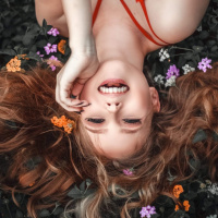 flower petals scattered around her, suggesting a natural, possibly garden-like setting. The background is out of focus, emphasizing the subject in the foreground.