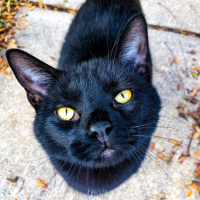 The picture features a black cat with striking yellow eyes. It appears to be sitting on a concrete surface, likely outdoors given the presence of what looks like leaves in the background. The cat has an alert posture, looking directly at the camera with its mouth slightly open as if it's either meowing or about to do so.
