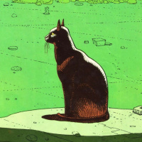 book panel featuring a cat. The cat, which appears to be sitting or lying down on the ground, has a concerned or alert expression. Its ears are up and its eyes are open wide. In the background, there are