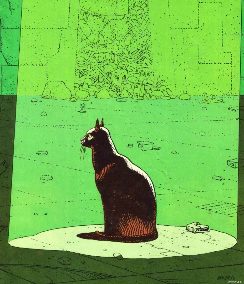 rocky formations that give the impression of a desolate or otherworldly landscape. The color palette is quite limited with a dominant greenish hue to the scene, which adds to the surreal or sci-fi atmosphere of the comic