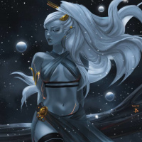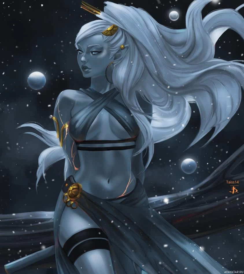 white hair and what appears to be elven features. She is wearing an outfit that resembles