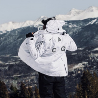 ski gear, including skis and a helmet, suggesting they might be engaging in skiing activities. They are also holding up their jacket, possibly for better ventilation or comfort while outdoors in