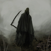The image depicts a dark and eerie scene. It features a figure that resembles the Grim Reaper,
