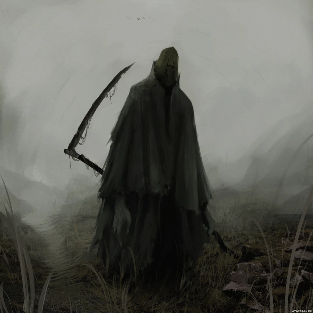 a mythical character often associated with death. This figure is holding a scythe in one hand, which is commonly used as a symbol of