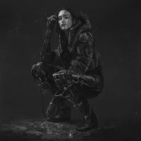 a female character who appears to be a brunette. She is depicted in a crouched pose, and her attire and the overall ambiance of the picture suggest that she could be part of