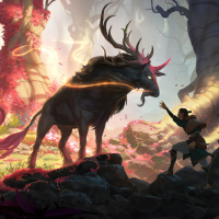 a fantastical scene set in a lush, magical forest. There's