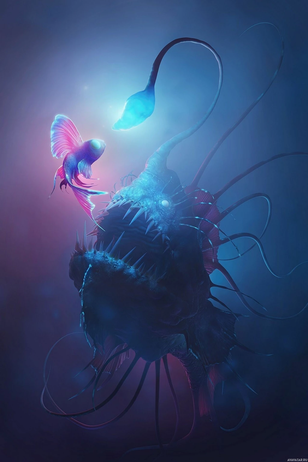a fantastical scene with a large, monstrous fish-like creature in the foreground. This creature has tentacles and a menacing appearance, occupying