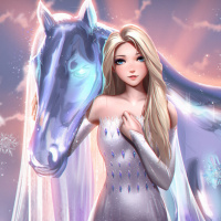 blonde hair, dressed in an ethereal, sparkling gown. She is holding onto a horse's head or neck. The setting appears to be outdoors at dusk, as indicated by