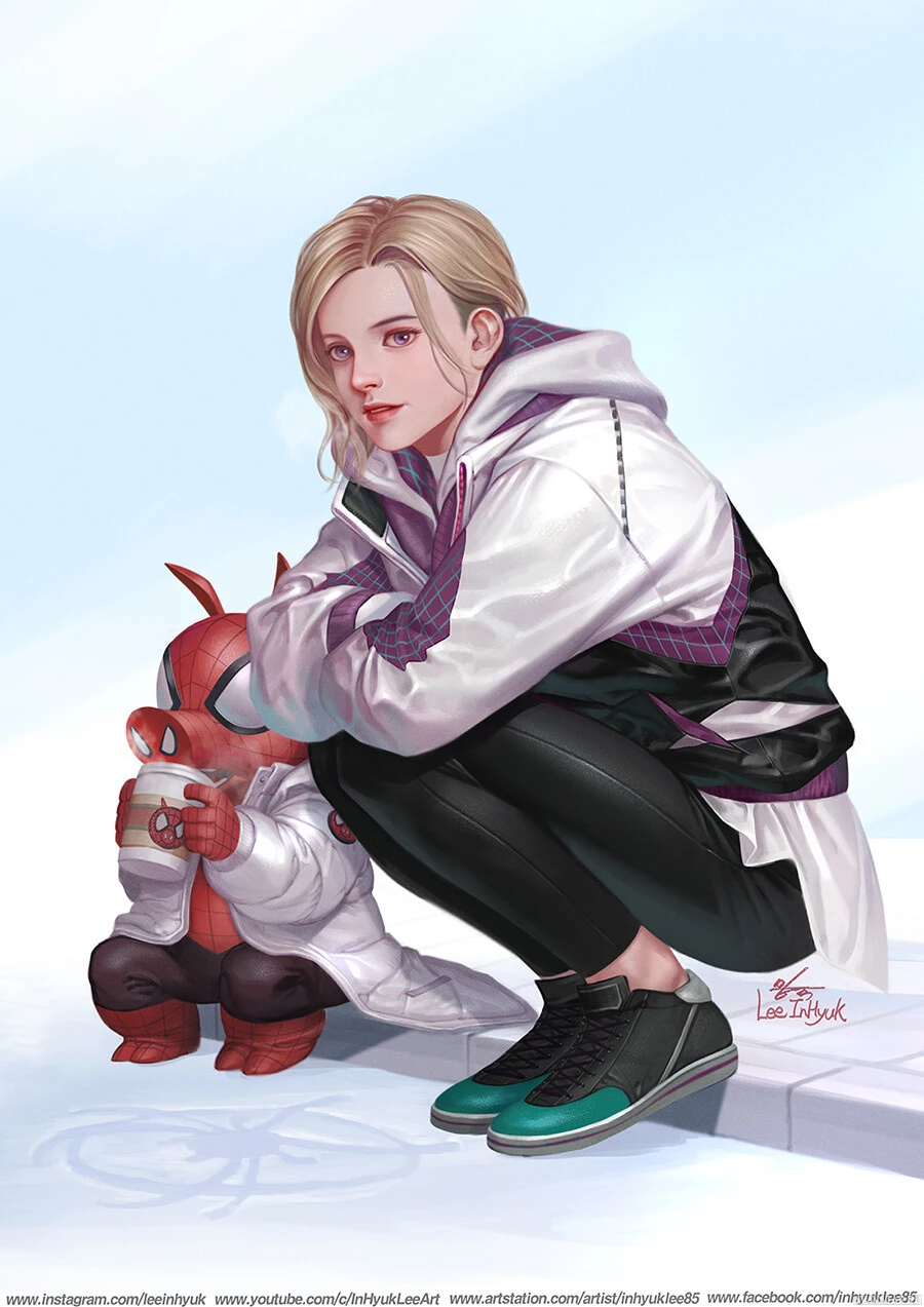 blonde hair. She is dressed in